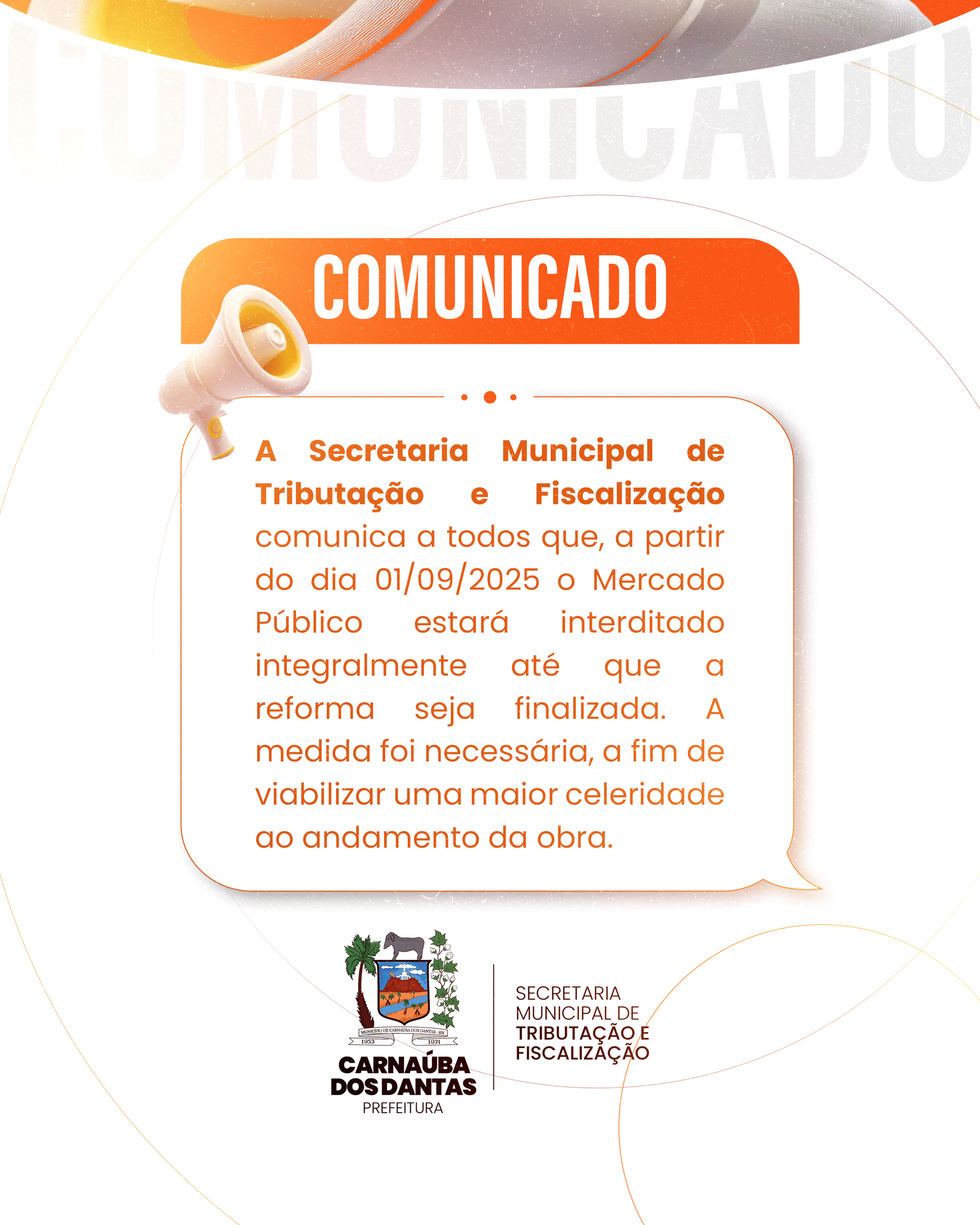 A Secretaria Municipal de Tributação e Fiscalização informa que, a partir do dia 1º de setembro de 2025, o Mercado Público de Carnaúba dos Dantas estará interditado integralmente até a finalização da reforma.
